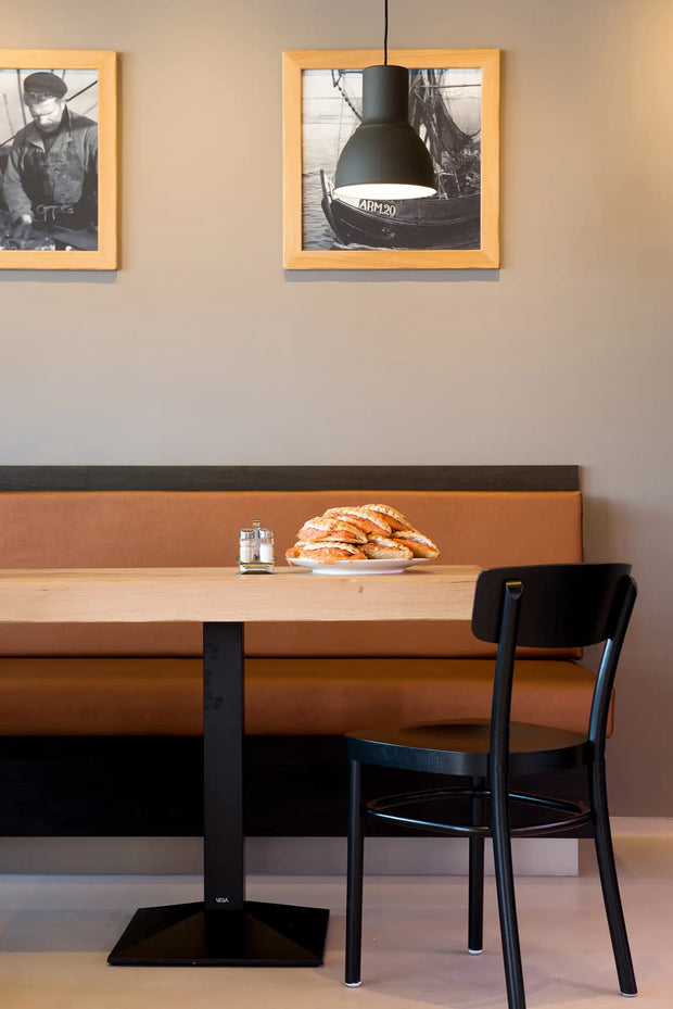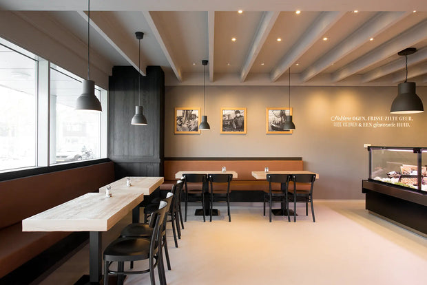 Vanaf het moment dat je binnenstapt, voel je de harmonie tussen natuurlijke materialen, warme tinten en verfijnde details. De authentieke uitstraling van het eikenhout vormt een warme omarming, terwijl de luxe zwartmetalen vitrines met verfijnde verlichting de dagverse vis laten schitteren als culinaire juwelen. De zorgvuldig gekozen verlichting, robuuste, industriële hanglampen, zorgen voor een intieme en geborgen sfeer.
