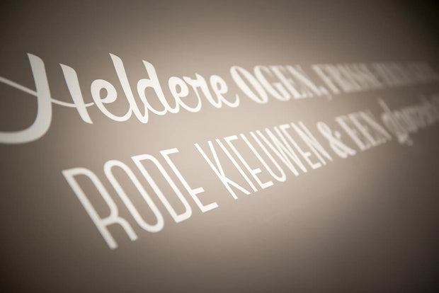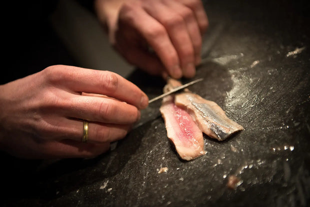 Het plafond met zichtbare balken geeft de ruimte een stoer karakter, terwijl de zwart-witte maritieme foto’s aan de wand een subtiele knipoog zijn naar het vissersverleden. Op de muren prijken stijlvolle teksten in sierlijke letters, die niet alleen decoratief zijn, maar ook het verhaal van puur vakmanschap en kwaliteit vertellen.