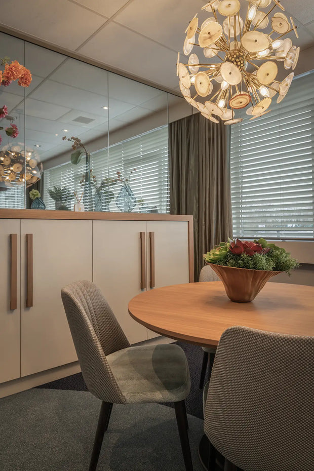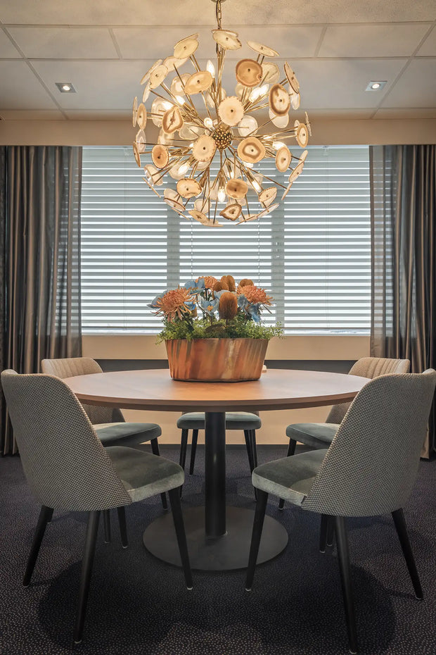 De verlichting boven de tafels is een kunstwerk op zich. Organisch gevormde armaturen met een zachte gloed, als zwevende lichtpunten die de gesprekken omarmen.