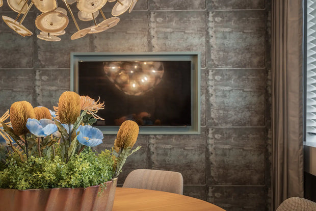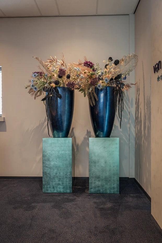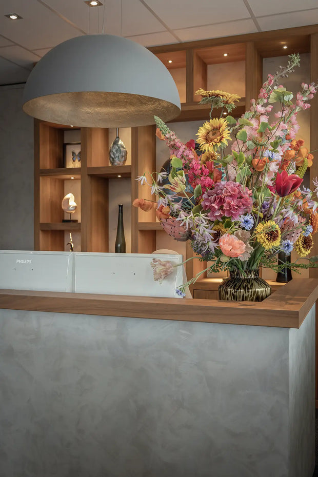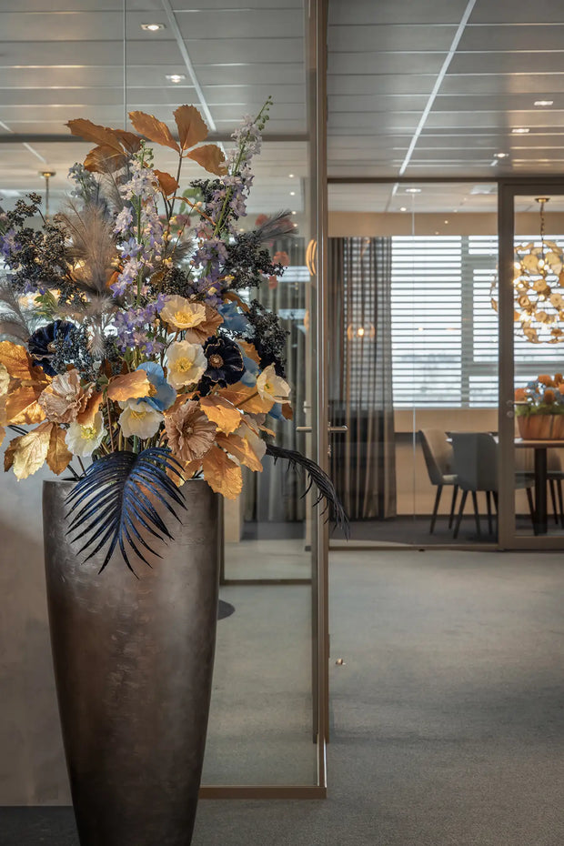 Fionora heeft de huisstijl van Van de Merwe op een verfijnde manier doorgevoerd in het interieur. De kleuren van het logo keren terug in de zuilen met luxe bloemarrangementen, de warme accentkleuren en zelfs in de details van de wandafwerking. Een subtiele maar krachtige verwijzing naar de identiteit van het bedrijf.