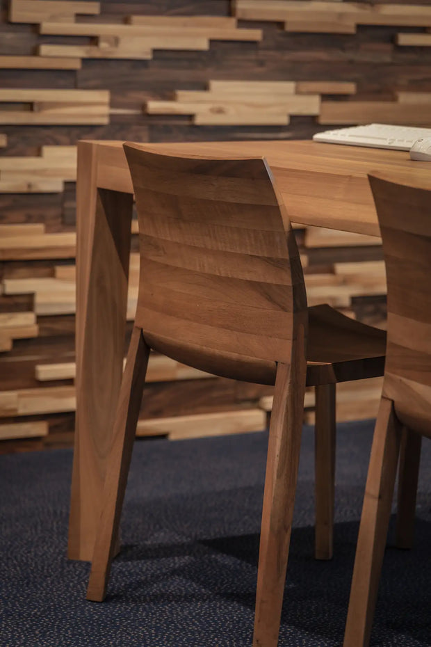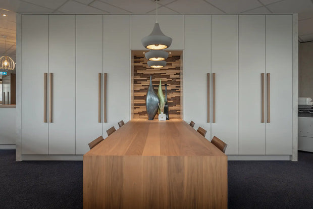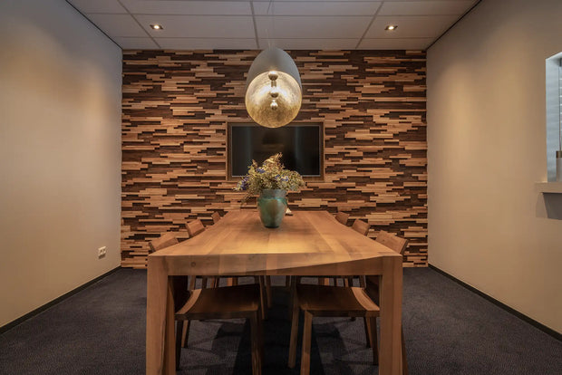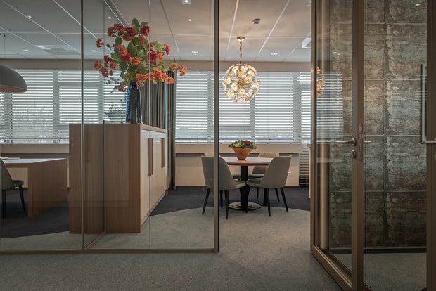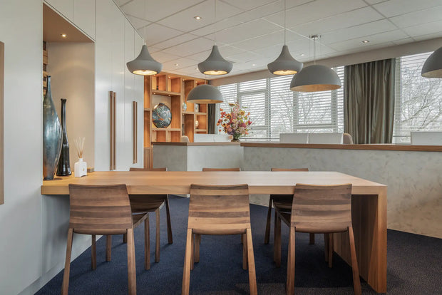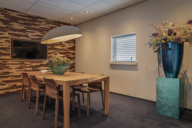 In de vergaderruimtes is er gespeeld met contrasten. Houten wanden met een 3D-patroon voegen diepte toe en breken de ruimte op een stijlvolle manier. De lange vergadertafels, vervaardigd uit massief hout, stralen kracht en duurzaamheid uit. Hier worden beslissingen genomen, verhalen verteld en toekomstplannen gesmeed.