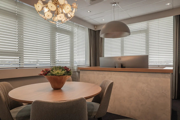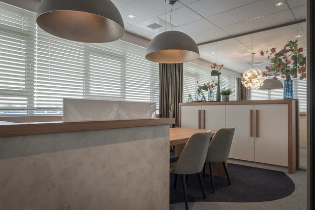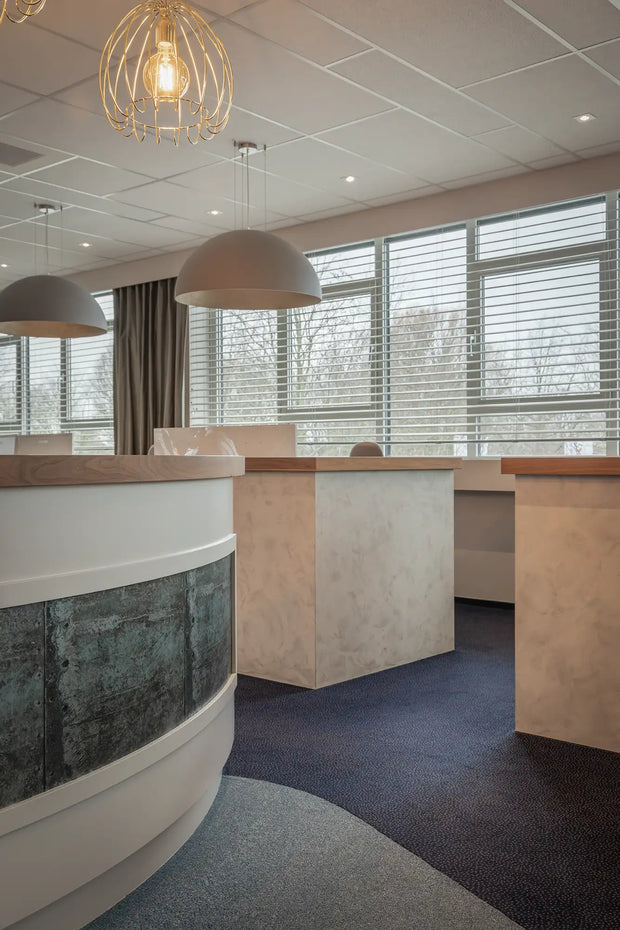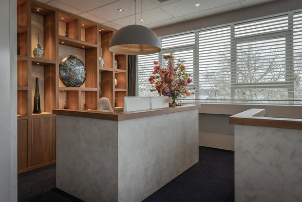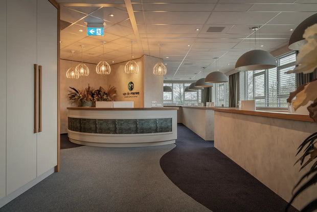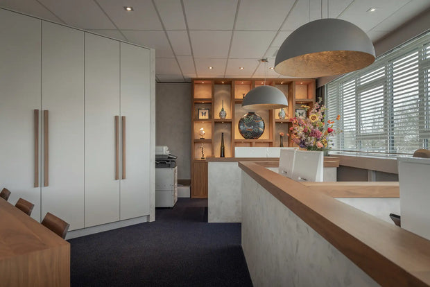 Bij binnenkomst ervaar je direct een gevoel van openheid en transparantie. De balie is uitnodigend en centraal geplaatst, met een ronde vorm die zachtheid en toegankelijkheid uitstraalt. De verlichting, zorgvuldig gekozen in organische, sfeervolle armaturen, draagt bij aan een intieme, huiselijke beleving.