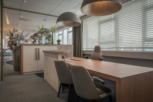Het interieur speelt met natuurlijke materialen en zachte tinten, waardoor een harmonieus geheel ontstaat. De houten accenten, van de verfijnde wandafwerking tot de op maat gemaakte kasten, geven een gevoel van rust en vertrouwen. De organische vormen en subtiele details in de afwerking zorgen ervoor dat de ruimte niet alleen esthetisch aantrekkelijk is, maar ook prettig aanvoelt voor de mensen die er werken én de ondernemers die hier binnenstappen.