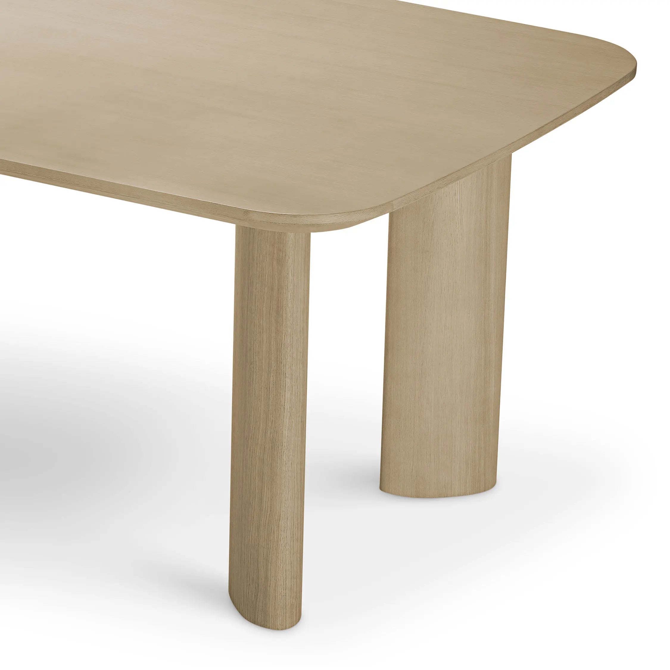 De rechthoekige tafel is afgewerkt met een stijlvol natuurlijk eikenfineer en heeft afgeronde hoeken en ellipsvormige poten voor een uniek vleugje stijl. Het natuurlijke fineer voegt verfijning en veelzijdigheid toe aan elke eethoek, waardoor het een perfect middelpunt is voor zowel formele bijeenkomsten als informele maaltijden.