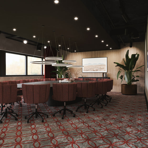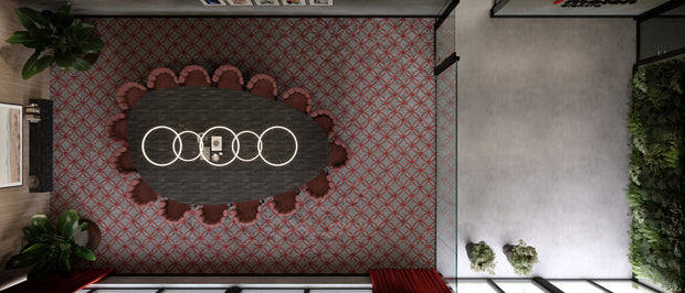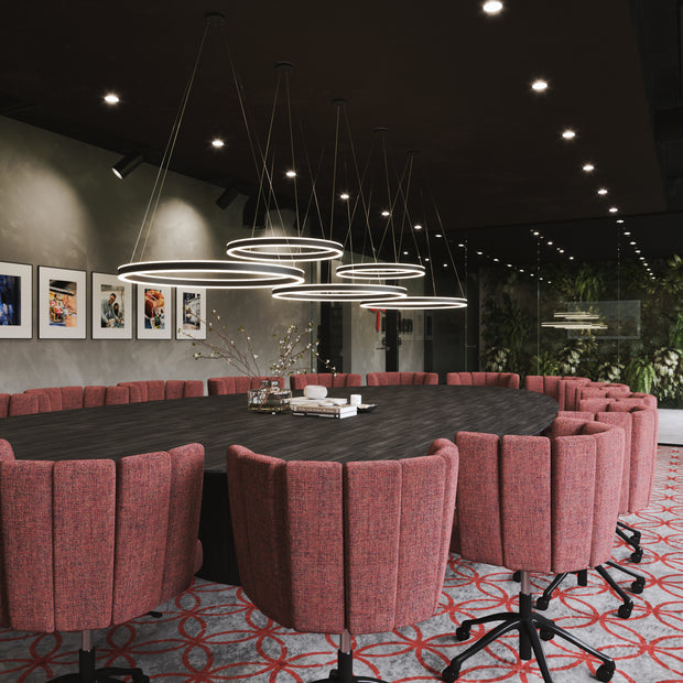 Het licht is zodanig ontworpen dat het de ruimte niet alleen verlicht, maar tot leven wekt. De ringen boven de tafel lijken haast te zweven, ze stralen rust uit, ritme, helderheid. Ze dragen bij aan een sfeer waarin ideeën mogen ontstaan, groeien, en gedeeld worden.