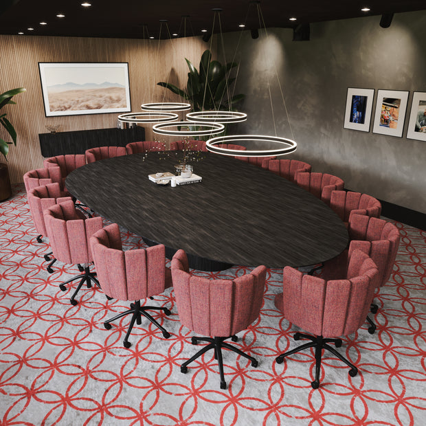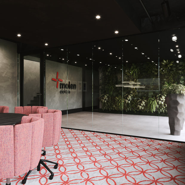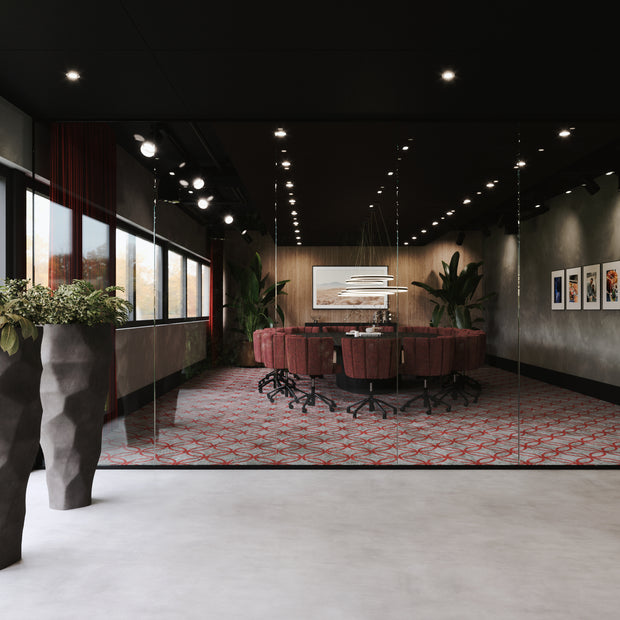 De tafel vormt het hart van de ruimte. Geen standaard rechthoek, maar een organisch ontwerp op maat, dat zachtheid toevoegt aan de zakelijke setting. Rondom staan stoelen in een rijk rood textiel, een verwijzing naar de huisstijl van Molen Elektra, maar in een uitvoering die comfort én uitstraling combineert.