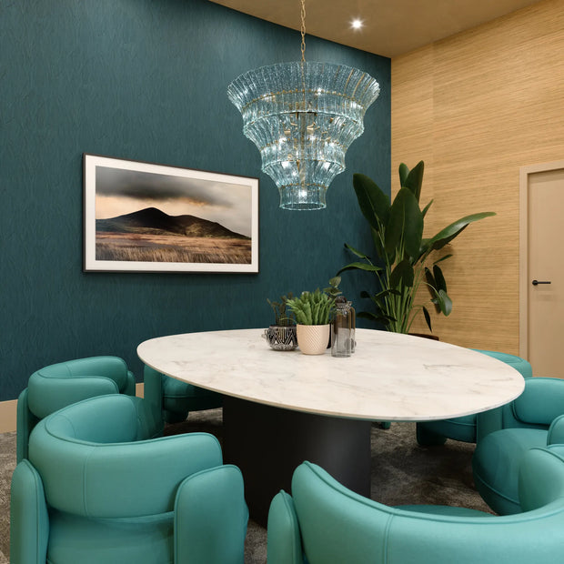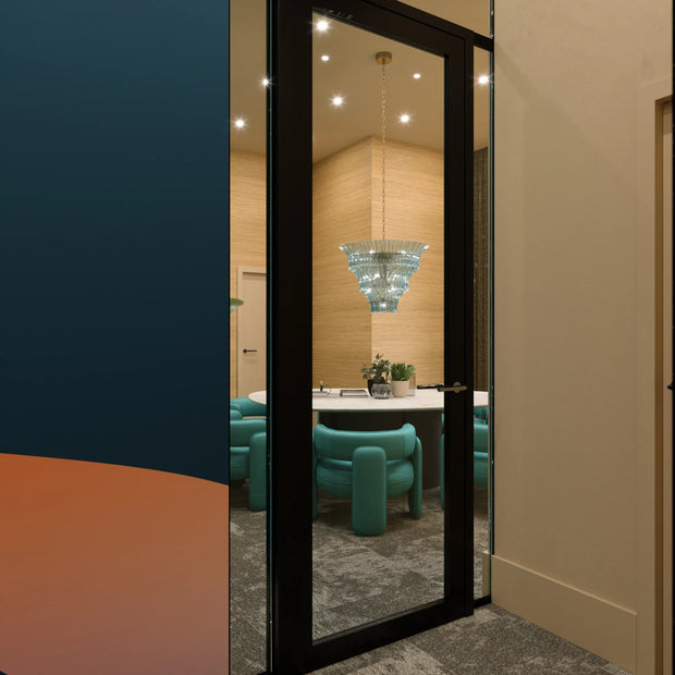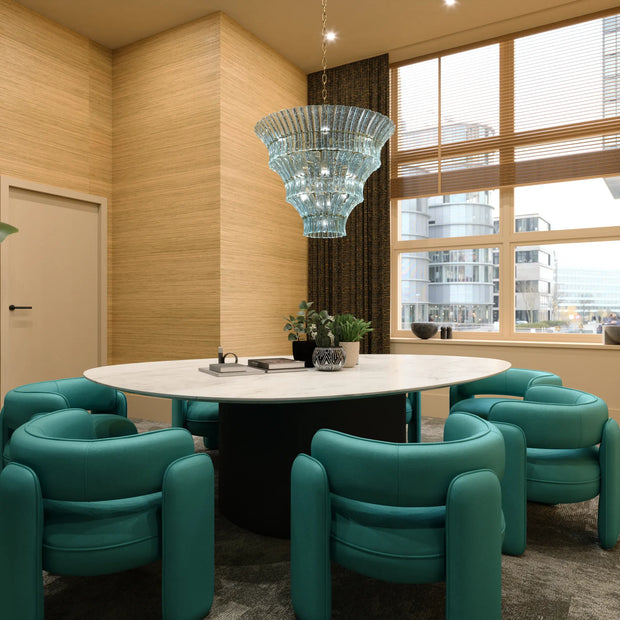 De ruimte is verder aangekleed met rijke texturen, een weelderige blauwe wand, natuurlijke materialen en een majestueuze glazen kroonluchter die het licht als een dans laat neerdalen. Elk element draagt bij aan het gevoel van welkom. Van aandacht. Van menselijke maat.