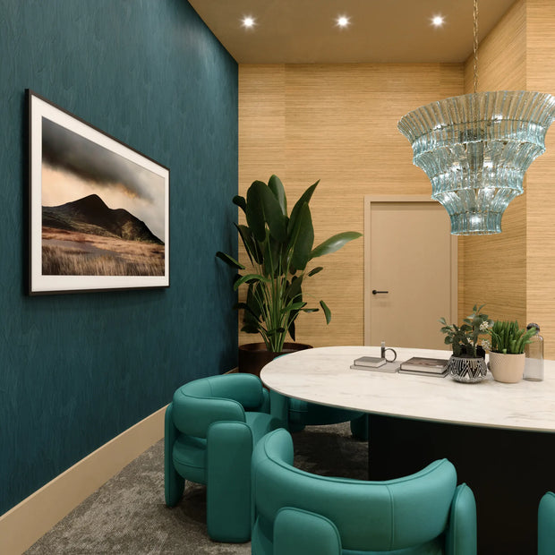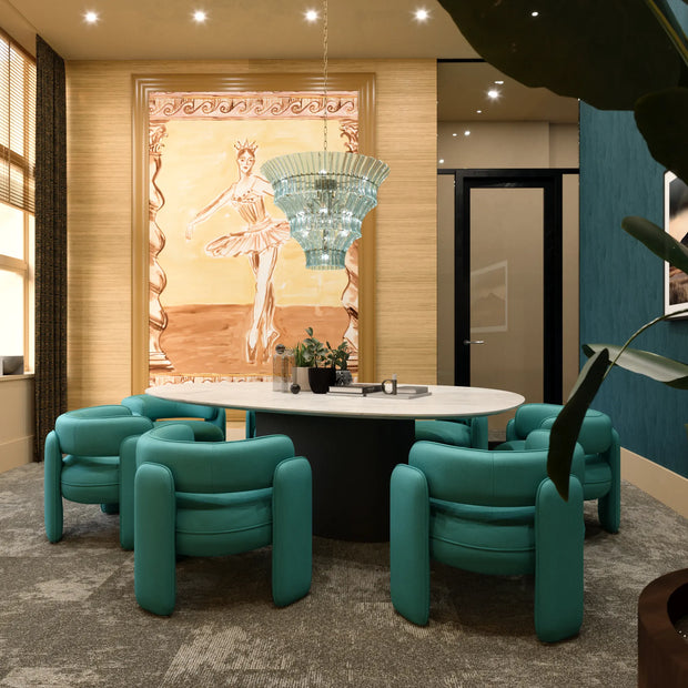 Aan de wand prijkt een expressief werk van de Engelse kunstenaar Luke Edward Hall, bekend om zijn kleurrijke verbeeldingskracht, die moeiteloos klassieke elegantie verbindt met speelse fantasie. Zijn werk brengt lucht en lichtheid, een visuele knipoog die je uitnodigt om niet alleen zakelijk, maar ook intuïtief te kijken.