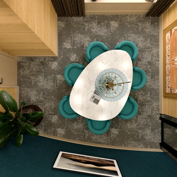 De stoelen eromheen volgen datzelfde gedachtegoed. Zacht, rond, omarmend. Geen design om het design, maar een vormtaal die rust brengt in het gesprek. Die veiligheid ademt en openheid stimuleert. Dit is de plek waar ideeën kunnen landen en groeien.