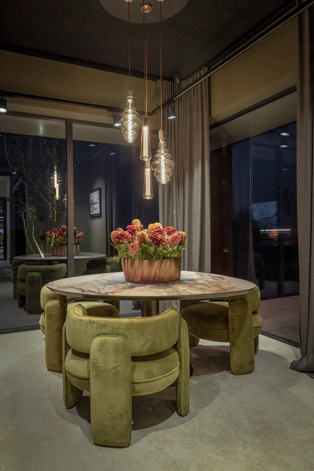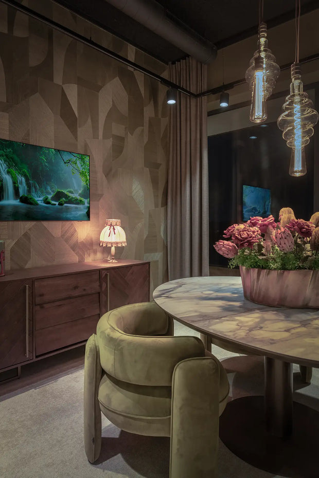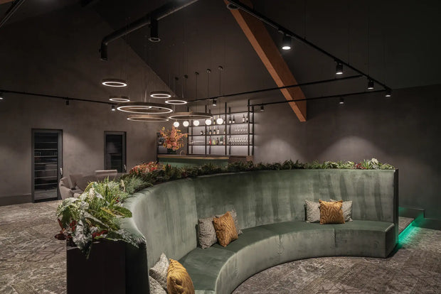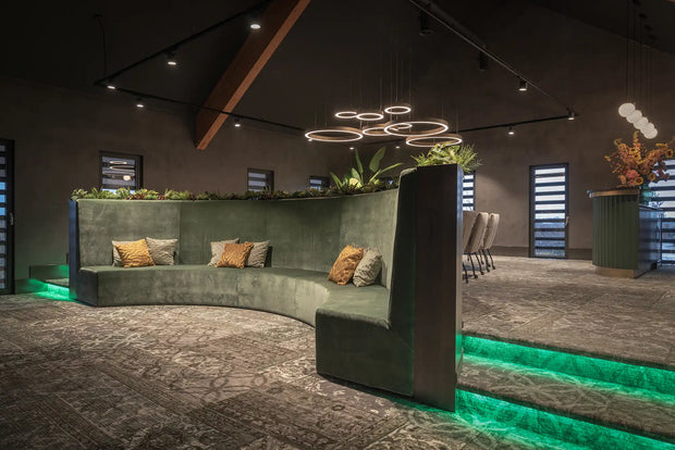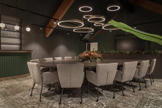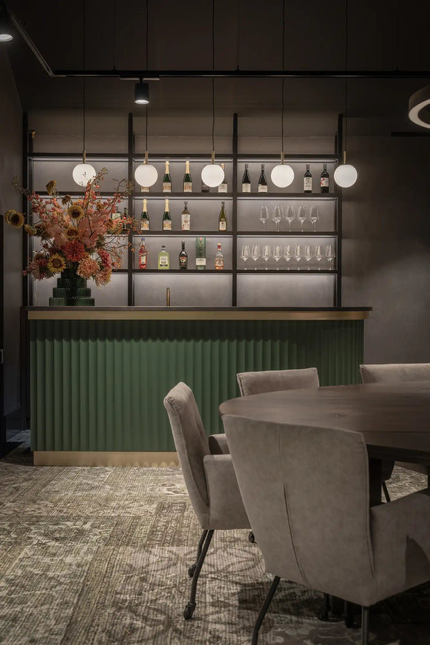 Elke ruimte binnen Volentis heeft een eigen karakter. Van vergaderruimtes met zachte, ronde vormen en luxueuze stoffering tot het verhoogde podium met een imposante ovale tafel. De grote vergaderzaal nodigt uit tot inspirerende presentaties, terwijl de halfronde bank zorgt voor een unieke en comfortabele setting. En dan is er nog de bar, een verfijnde ontmoetingsplek, waar gesprekken net zo vloeiend verlopen als de zorgvuldig geselecteerde wijnen op de plank.