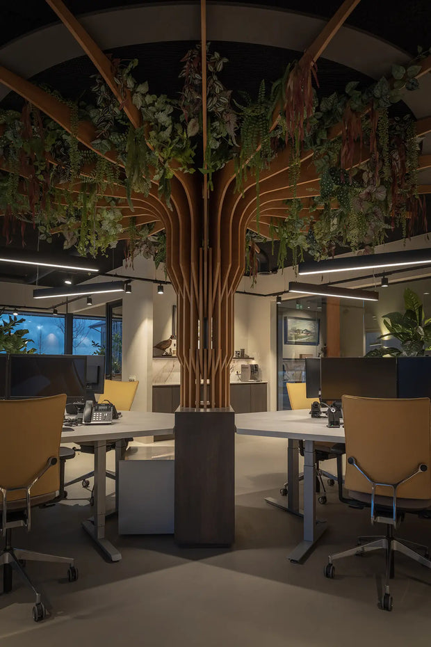 Volentis ademt groen en transparantie. Dit zie je direct terug in de kantoortuin, waar werkplekken als dynamische driehoeken zijn gegroepeerd rond een imposante houten ‘parasol’, bekleed met levend groen. Hier worden ideeën geplant en laten ze wortel schieten. De warme tinten, natuurlijke materialen en op maat gemaakte meubelen zorgen voor een sfeer die zowel rustgevend als inspirerend is.