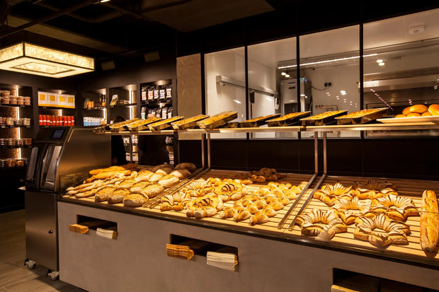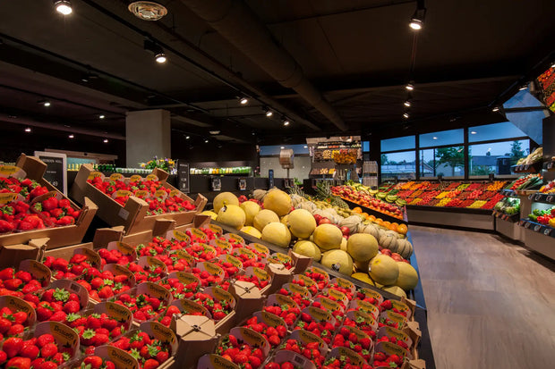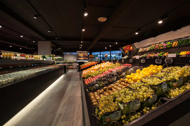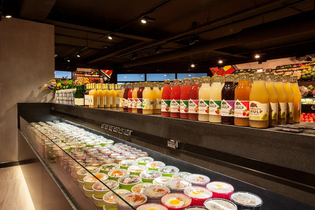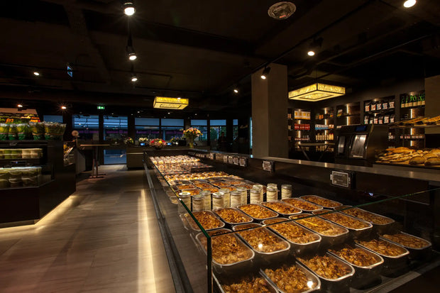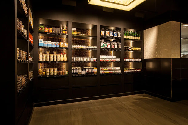 Elke hoek van de winkel ademt luxe en exclusiviteit. Door het gebruik van donkere tinten in combinatie met subtiele, warme verlichting komen de producten optimaal tot hun recht. De diepe zwarttinten geven een chique, bijna theatrale uitstraling, waardoor de versproducten als juwelen schitteren in hun presentatie. De strakke, minimalistische toonbanken en schappen zorgen voor een moeiteloze klantreis, waarbij de kwaliteit van Landwaart Culinair centraal staat.