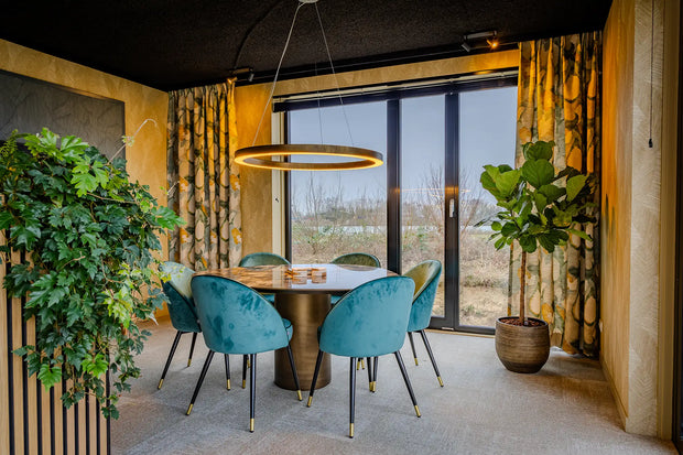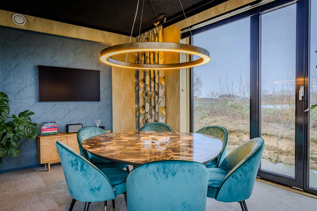Boven de vergadertafel hangt een majestueuze ronde lamp, een gouden cirkel die zweeft als een aureool van inspiratie. Het licht is zacht, warm en versterkt de intieme sfeer waarin gesprekken opbloeien. Elders in de ruimte zorgen subtiele indirecte lichtbronnen voor een gebalanceerde ambiance, waarin functionaliteit en beleving samensmelten.