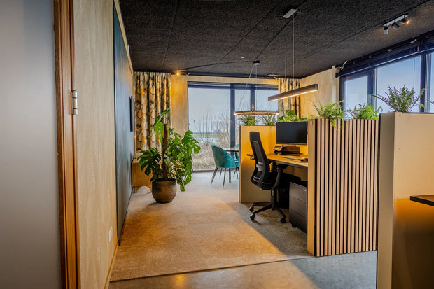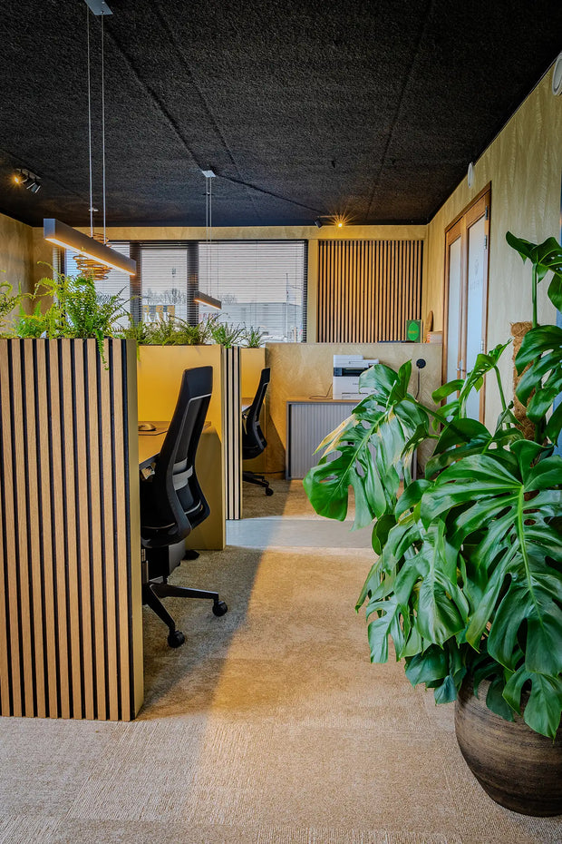 De werkplekken zijn met zorg afgeschermd door elegante houten lamellen, die privacy creëren zonder de openheid van de ruimte te verliezen. Overal is groen, niet als decor, maar als een levend element dat adem geeft aan het interieur. Grote planten versterken het contact met de natuur en zorgen voor een serene balans tussen concentratie en ontspanning.