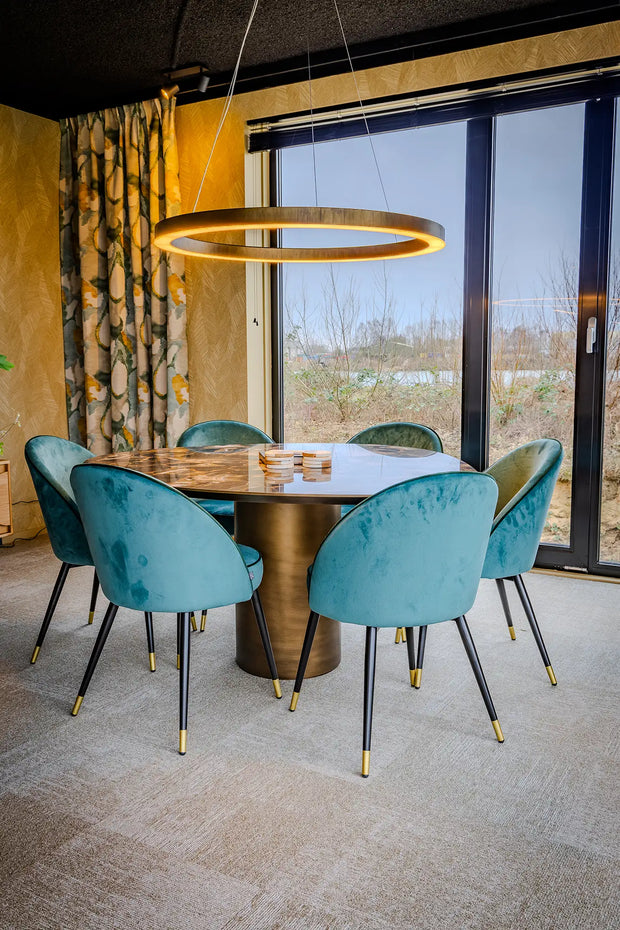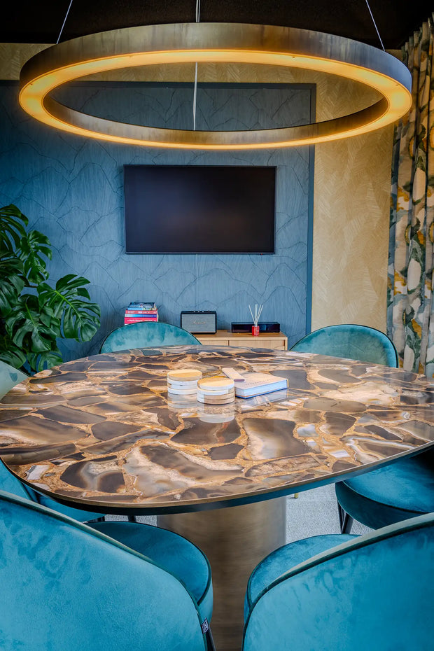 De ronde vergadertafel vormt het hart van de ruimte, met een betoverend blad van diep agaat gesteente. De gelaagdheid van het materiaal lijkt een verhaal te vertellen, alsof het door de eeuwen heen gevormd is om juist hier tot zijn recht te komen. De fluwelen turquoise stoelen omringen de tafel als edelstenen, een samenspel van comfort en elegantie.